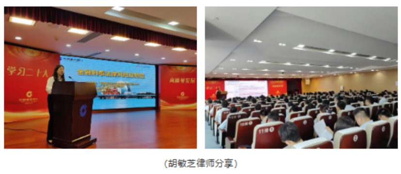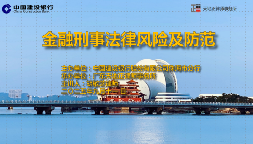 2025年9月11日上午,天地正律师所应邀为珠海建行开展《金融刑事法律风险及防范》讲座。其行领导、部门负责人、网点负责人以及信贷客户经理等约250人参加。天地正律师所副主任胡敏芝律师主讲。