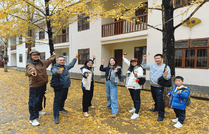 银杏林依山起伏,旧厂房掩映其间。我们并肩漫步,在镜头定格的瞬间,笑容与金叶一同被收藏。现代冬日的写意与往昔岁月的故事,都融在这一幅流动的鎏金画卷之中。